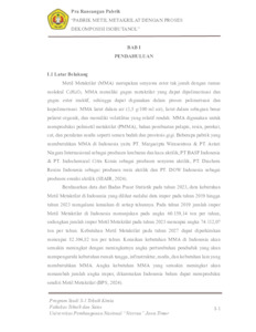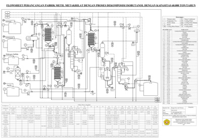 Pabrik Metil Metakrilat dengan kapasitas 60.000 ton/tahum akan didirikan di Kawasan Industri Krakatau, Cilegon, Provinsi Banten. Pabrik ini akan beroperasi selama 24 jam dalam sehari dan selama 330 hari dalam setahun. Metil metakrilat menggunakan bahan baku isobutanol yang diperoleh dari PT. Petro Oxo Nusantara. Produk Metil Metakrilat dapat digunakan sebagai bahan memproduksi polimetil metakrilat (PMMA), bahan pembuatan pelapis, resin, perekat, cat, dan peralatan medis seperti semen bedah dan prostesis gigi. Bahan kimia Metil Metakrilat dapat diproduksi dengan beberapa macam proses, yaitu proses Acetone Cyanohydrin (ACH), Metil Metakrilat dari Isobutilena, Metil Metakrilat dari Etilen, dan Dekomposisi Isobutanol. Proses pembuatan Metil Metakrilat menggunakan proses Dekomposisi Isobutanol secara singkat yaitu dimulai dengan mengubah fase isobutanol ke fase gas dan melakukan dekomposisi isobutanol dalam reaktor dengan konversi 98,83% untuk mendapatkan gas isobutilen. Gas isobutilen akan dilakukan oksidasi dalam reaktor dengan konversi 72,7% untuk mendapat gas metakrolein. Gas metakrolein akan dirubah fase menjadi liquid untuk dimasukkan ke dalam reaktor esterifikasi dengan konversi 70% untuk mendapatkan produk Metil Metakrilat. Ketentuan pendirian pabrik Metil Metakrilat yang telah direncanakan dapat disimpulkan sebagai berikut: 1. Kapasitas Produksi : 60.000 Ton/Tahun 2. Bentuk Organisasi : Perseroan Terbatas 3. Sistem Organisasi : Garis dan Staff 4. Lokasi Pabrik : Kawasan Industri Krakatau, Cilegon, Provinsi Banten 5. Sistem Operasi : Kontinyu 6. Waktu Operasi : 330 Hari/Tahun ; 24 Jam/Hari 7. Jumlah Karyawan : 194 8. Analisa Ekonomi a. Modal Tetap (FCI) : Rp. 536.945.071.688 b. Working Capital Investment (WCI) : Rp. 466.822.368.151 c. Total Capital Investment (TCI) : Rp. 1.003.767.439.838 d. Bahan Baku (1 Tahun) : Rp. 560.445.880.701 e. Biaya Utilitas (1 Tahun) : Rp. 799.926.108.557 f. Total Production Cost (TPC) : Rp. 1.867.289.472.602 g. Bunga Bank : 7,82% per Tahun h. Return of Investment (Before tax) : 38,26% i. Return of Investment (After Tax) : 28,7% j. Internal Rate of Return (IRR) : 25,73% k. Pay Back Periode (PBP) : 3 tahun 4 bulan l. Break Even Point (BEP) : 40,05%