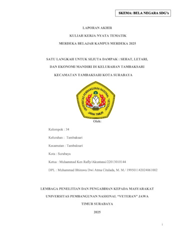 Adelina, Melynda Berly and Rafly, Muhammad Ken and Winona, Varsha Aurel and Damanda, Sherya and Fitria, Nur Lailatul (2025) SATU LANGKAH UNTUK SEJUTA DAMPAK : SEHAT, LETARI,DAN EKONOMI MANDIRI DI KELURAHAN TAMBAKSARI KECAMATAN TAMBAKSARI KOTA SURABAYA. LPPM UPN "VETERAN" JAWA TIMUR, Surabaya. (Unpublished)