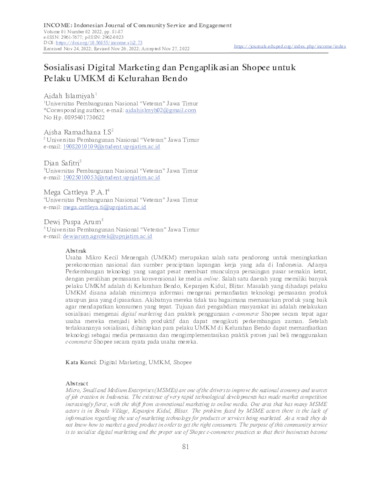 Islamiyah, Aidah and Ramadhana I.S, Aisha and Safitri, Dian (2025) Sosialisasi Digital Marketing dan Pengaplikasian Shopee untuk Pelaku UMKM di Kelurahan Bendo. Indonesian Journal of Community Service and Engagement, 01 (02). pp. 81-87. ISSN e2961-7677 (Unpublished)