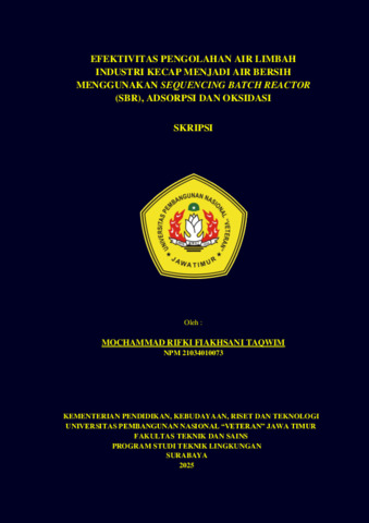 Taqwim, Mochammad Rifki Fiakhsani (2025) EFEKTIVITAS PENGOLAHAN AIR LIMBAH INDUSTRI KECAP MENJADI AIR BERSIH MENGGUNAKAN SEQUENCING BATCH REAKTOR (SBR), ADSORPSI, DAN OKSIDASI. Undergraduate thesis, UPN "Veteran" Jawa Timur.