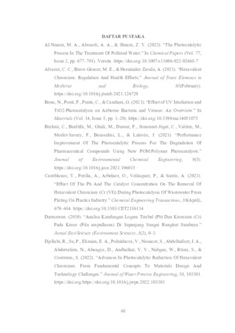 Wibisono, Moch. Andy (2025) Analisis Kinetika Reaksi Penurunan Logam Berat Cr (VI) Pada Limbah Industri Pelapisan Logam Menggunakan Resin Immobilized Photocatalyst TiO2. Undergraduate thesis, UPN Veteran Jawa Timur.