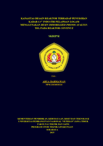 Darmawan, Arya (2025) Kapasitas Desain Reaktor terhadap Penyisihan Kadar Cr6+ Industri Pelapisan Logam Menggunakan Resin Immobilized Photocatalyst-TiO2 pada Reaktor Continue. Undergraduate thesis, UPN Veteran Jawa Timur.