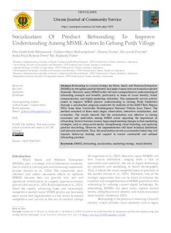 Rebranding is a crucial strategy for Micro, Small, and Medium Enterprises (MSMEs) to strengthen product identity and make it more relevant to modern market demands. However, many MSME actors still lack a comprehensive understanding of rebranding concepts and benefits, particularly in terms of visual identity, brand communication, and digital marketing utilization. This community service activity aimed to improve MSME players' understanding in Gebang Putih Subdistrict through a socialization program conducted by students of the KKNT Bela Negara SDGs team from Universitas Pembangunan Nasional Veteran Jawa Timur. The method consisted of three main stages: observation, interactive socialization, and evaluation. The results showed that the socialization was effective in raising awareness and motivation among MSME actors regarding the importance of
