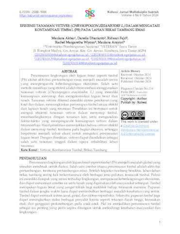 Akbar, Maulana and Dharianto, Danella and Fajri, Ridwan and Wiyoso, Rachel Margaretha (2024) EFISIENSI TANAMAN VETIVER (CHRYSOPOGON ZIZANIODES L.) DALAM MENGATASI KONTAMINASI TIMBAL (PB) PADA LAHAN BEKAS TAMBANG EMAS. EFISIENSI TANAMAN VETIVER (CHRYSOPOGON ZIZANIODES L.) DALAM MENGATASI KONTAMINASI TIMBAL (PB) PADA LAHAN BEKAS TAMBANG EMAS, 4 (9). pp. 1-6. ISSN 2988-1986 (Unpublished)