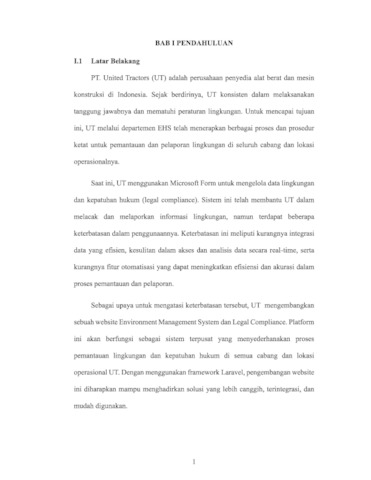 PT. United Tractors (UT) merupakan perusahaan yang bergerak di bidang penyediaan alat berat dan mesin konstruksi di Indonesia. Untuk memenuhi tanggung jawab lingkungan dan kepatuhan hukum, UT mengembangkan sistem Environment Management System (EMS) dan Legal Compliance menggunakan framework Laravel. Pengembangan ini bertujuan untuk mengatasi keterbatasan dari sistem sebelumnya yang menggunakan Microsoft Form, meningkatkan efisiensi pengelolaan data lingkungan, dan memastikan kepatuhan hukum di seluruh cabang operasional UT. Proyek pengembangan ini menggunakan metode perancangan sistem yang meliputi analisis kebutuhan, desain arsitektur sistem, perancangan database, dan implementasi baik untuk back-end maupun front-end. Data dikumpulkan melalui wawancara, observasi, dan studi literatur terkait pengelolaan lingkungan dan teknologi web. Pengembangan website EMS dan Legal Compliance berhasil menghasilkan sistem terpusat yang terintegrasi, memudahkan proses pemantauan dan pelaporan lingkungan di seluruh cabang UT. Sistem ini juga mengotomatisasi banyak proses yang sebelumnya manual, meningkatkan akurasi dan efisiensi data. Kesimpulan dari pengembangan ini menunjukkan bahwa sistem baru berhasil mengatasi berbagai keterbatasan sistem sebelumnya, meningkatkan efisiensi, akurasi, dan memastikan kepatuhan regulasi. Disarankan kepada tim IT PT. United Tractors untuk terus mengembangkan dan menyempurnakan fitur-fitur sistem ini, kepada manajemen untuk memberikan pelatihan berkala kepada karyawan, dan kepada departemen terkait untuk melakukan evaluasi berkala terhadap sistem.