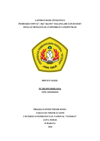 Berliana, Putri Dwi (2025) Pemisahan Ion Ca2+, Mg2+ dan SO42- dalam Larutan Bittern dengan Menggunakan Membran Nanofiltrasi. Undergraduate thesis, UPN Veteran Jawa Timur.