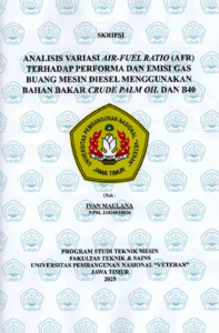 Maulana, Ivan (2025) Analisis Variasi Air-Fuel Ratio (AFR) Terhadap Performa dan Emisi Gas Buang Mesin Diesel Menggunakan Bahan Bakar Crude Palm Oil dan B40. Undergraduate thesis, UPN "Veteran" Jawa Timur.