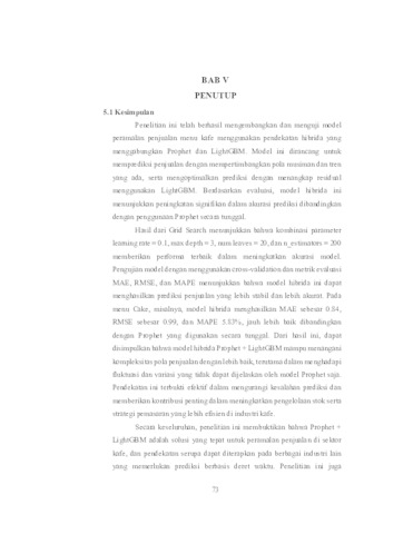 Industri kafe berkembang pesat, dengan tantangan utama berupa ketidakpastian permintaan pelanggan. Ketidakpastian ini dapat menyebabkan kekurangan stok (understocking) maupun kelebihan stok (overstocking), yang berdampak pada berkurangnya kepuasan pelanggan serta kerugian finansial. Untuk mengatasi hal tersebut, sistem peramalan penjualan yang akurat diperlukan guna mengoptimalkan perencanaan operasional, pengelolaan stok, serta strategi pemasaran. Penelitian ini bertujuan mengembangkan model hybrid yang mampu meningkatkan akurasi prediksi penjualan menu kafe dengan menggabungkan algoritma Facebook Prophet dan Light Gradient Boosting Machine (LightGBM). Prophet digunakan untuk menangkap pola musiman dan tren jangka panjang pada data deret waktu, sementara LightGBM digunakan untuk memodelkan residual Prophet dan menemukan hubungan antar variabel yang lebih kompleks. Dataset yang digunakan terdiri dari lebih dari 10 ribu transaksi penjualan kafe yang diperoleh dari platform Kaggle. Proses penelitian meliputi pembersihan data, transformasi, agregasi harian, pembagian dataset dengan rasio 80:10:10 dan 70:15:15, serta optimasi hyperparameter menggunakan Grid Search. Hasil dari Grid Search menunjukkan bahwa kombinasi parameter learning rate = 0.1, max depth = 3, num leaves = 20, dan n_estimators = 200 memberikan performa terbaik dalam meningkatkan akurasi model. Pengujian model dengan menggunakan cross-validation dan metrik evaluasi MAE, RMSE, dan MAPE menunjukkan bahwa model hibrida ini dapat menghasilkan prediksi penjualan yang lebih stabil dan akurat. Pada menu Cake, misalnya, model hibrida menghasilkan MAE sebesar 0.84, RMSE sebesar 0.99, dan MAPE 5.83%, jauh lebih baik dibandingkan Prophet tunggal yang memperoleh MAE 4.10, RMSE 5.18, dan MAPE 29.86%. Selain itu, hasil penelitian juga menunjukkan bahwa skenario pembagian dataset 80:10:10 memberikan performa terbaik dibandingkan dengan 70:15:15., Hasil penelitian ini membuktikan bahwa penggabungan Prophet dan LightGBM dalam kerangka hybrid model mampu meningkatkan performa prediksi penjualan menu kafe secara signifikan. Kata Kunci: Peramalan Penjualan, Deret Waktu, Facebook Prophet, LightGBM, Model Hybrid, Kafe.