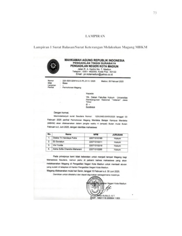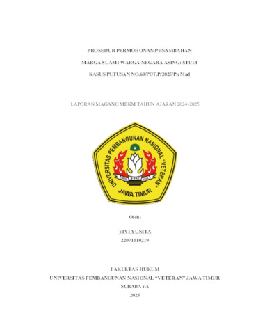 Vivi, Yunita (2025) Prosedur Permohonan Penambahan Marga Suami Warga Negara Asing: Studi Kasus Putusan No. 60/PDT.P/2025/Pn Mad. Project Report (Praktek Kerja Lapang dan Magang). Fakultas Hukum UPN VETERAN JATIM, Surabaya. (Unpublished)