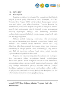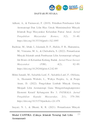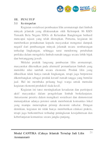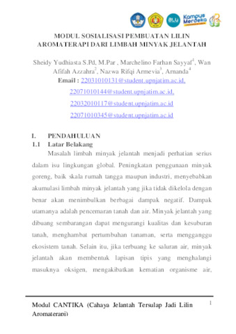 SAYYAF, MARCHELINO FARHAN and AZZAHRA, WAN AFIIFAH and ARMEVIA, NAZWA RIFQI and ARNANDA, ARNANDA (2025) MODUL PEMBUATAN LILIN AROMA TERAPI DARI LIMBAH MINYAK JELANTAH. Other. UNIVERSITAS PEMBANGUNAN NASIONAL “VETERAN” JAWA TIMUR, SURABAYA. (Unpublished)