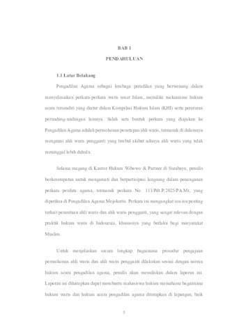 Vanessa, Aurelia (2025) Prosedur Permohonan Penetapan Ahli Waris Dan Ahli Waris Pengganti di Kantor Hukum Wibowo & Partners Melalui Pengadilan Agama Mojokerto (Perkara No 113/Pdt.P/2025/PA.Mr). Project Report (Praktek Kerja Lapang dan Magang). Fakultas Hukum, Surabaya, Indonesia. (Unpublished)