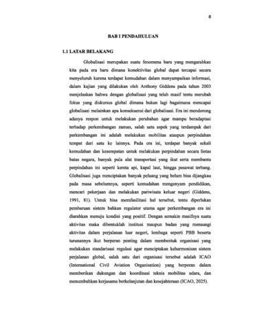 Globalisasi merupakan suatu fenomena baru yang mengarahkan kita pada era baru dimana konektivitas global dapat tercapai secara menyeluruh karena terdapat kemudahan dalam menyampaikan informasi, dalam kajian yang dilakukan oleh Anthony Giddens pada tahun 2003 menjelaskan bahwa dengan globalisasi yang telah masif tentu merubah fokus yang diskursus global dimana bukan lagi bagaimana mencapai globalisasi melainkan apa konsekuensi dari globalisasi. Era ini mendorong adanya respon untuk melakukan perubahan agar mampu beradaptasi terhadap perkembangan zaman, salah satu aspek yang terdampak dari perkembangan ini adalah melakukan mobilitas ataupun perpindahan tempat dari satu ke lainnya. Pada era ini, terdapat banyak sekali kemudahan dan kesempatan untuk melakukan perpindahan secara lintas batas negara, banyak pula alat transportasi yang ikut serta membantu perpindahan ini seperti kereta api, kapal laut, hingga pesawat terbang. Globalisasi juga menciptakan banyak peluang yang belum bisa dijangkau pada masa sebelumnya, seperti kemudahan mengenyam pendidikan, mencari pekerjaan dan melakukan pariwisata keluar negeri (Giddens, 1991, 81). Untuk bisa memfasilitasi hal tersebut, tentu diperlukan pembaruan sistem bahkan regulator utama agar perkembangan era ini diarahkan menuju kondisi yang positif. Dengan semakin masifnya suatu aktivitas maka dibentuklah institusi maupun badan yang menaungi aktivitas dalam perjalanan luar negeri, lembaga seperti PBB beserta turunannya ikut berperan penting dalam membentuk organisasi yang melakukan standarisasi regulasi agar menciptakan keharmonisan sistem perjalanan global, salah satu dari organisasi tersebut adalah ICAO (International Civil Aviation Organisation) yang berperan dalam memberikan dukungan dan koordinasi teknis mobilitas udara, dan menumbuhkan kerjasama berkelanjutan dan kesejahteraan (ICAO, 2025). 9 Perjalanan lintas batas negara memerlukan dokumen khusus yang dipergunakan untuk menunjukkan identitas pribadi yang bersifat wajib untuk memberikan penanda sekaligus perlindungan kepada orang tersebut mengingat keberadaan mereka berada di luar wilayah negeri. Dokumen tersebut adalah paspor, paspor memiliki banyak ragamnya mulai dari paspor umum yang selalu dipergunakan dalam perjalanan keluar negeri hingga paspor diplomatik yang merupakan paspor spesial dikhususkan untuk pejabat pemerintahan suatu negara. Kini paspor berbentuk buku dokumen berukuran kecil dan berisikan identitas pribadi pemiliknya seperti foto, nama dan tempat-tanggal lahir beserta jenis kelamin, kemudian beberapa kertas yang dipergunakan untuk diberi stempel tanda bukti kehadiran orang tersebut di negara tujuan. Disisi lain, terdapat pula bukti perizinan yang diperlukan untuk bisa masuk ke dalam sebuah negara yaitu disebut sebagai Visa, umumnya untuk bisa mendapatkan Visa maka diperlukan untuk mengisi beberapa formulir yang isinya menjelaskan tujuan berkunjung ke negara yang didatangi, dengan kemajuan zaman kini visa tidak lagi harus ditulis tangan maupun datang secara fisik ke gedung pemerintahan negara, di Indonesia kini cukup melakukan pengisian formulir dalam sebuah website bernama E-Visa dimana dengan ini mempermudah perjalanan keluar negeri.