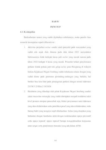This study examines the resolution of online Hong Kong-style illegal lottery (Toto Gelap) gambling cases within the jurisdiction of the Jombang District Attorney's Office. The background of the study is based on the increase in online gambling cases in Jombang, from zero in 2023 to four cases in 2024. The results of the discussion indicate that case resolution procedures are implemented based on the Criminal Procedure Code (KUHAP) mechanism, starting from investigation, inquiry, and prosecution in court. Obstacles encountered include network factors, selection of indictment articles, and evidence constraints. The study's conclusion emphasizes the need for preventive measures through legal counseling and repressive measures in the form of criminal sanctions.
