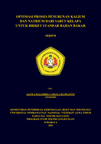 Kuswanto, Salwa Masahida Cahaya (2025) OPTIMASI PROSES PENURUNAN KALIUM DAN NATRIUM DARI SABUT KELAPA UNTUK BRIKET STANDAR BAHAN BAKAR. Undergraduate thesis, UPN "Veteran" Jawa Timur.
