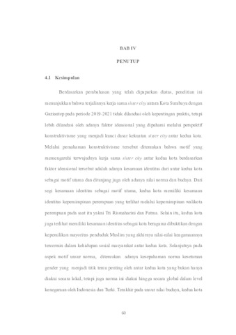 Kerja sama sister city menjadi salah satu bentuk paradiplomasi yang memberi ruang bagi pemerintah daerah untuk menjalin hubungan internasional secara langsung. Penelitian ini hadir untuk meneliti dinamika hubungan kerja sama sister city antara Kota Surabaya di Indonesia dan Kota Gaziantep di Turki pada periode 2019-2021. Fokus utama penelitian ini adalah mengidentifikasi motif apa saja yang melatarbelakangi kerja sama antar kedua kota dengan menggunakan perspektif konstruktivisme yang menitikberatkan pada peran identitas, norma, dan budaya dalam interaksi antar aktor non-negara. Metode penlitian yang digunakan dalam penelitian ini adalah kualitatif eksplanatif melalui pendekatan studi kasus. Data yang didapat melalui literatur seperti dokumen resmi pemerintah hukum dan kerjasama Kota Surabaya, portal berita, buku, beserta jurnal dan wawancara yang dilakukan pada Staff Hukum dan Kerjasama Kota Surabaya, Ketua Panitia Khusus sister city dan Kepala Bidang Pariwisata DISBUDPORAPAR Kota Surabaya. Analisis dilakukan dengan menyoroti peran identitas, norma, dan budaya sebagai faktor ideasional dalam membentuk hubungan kerja sama kedua kota. Hasil penelitian memperlihatkan bahwa terwujudnya kerja sama sister city antara Kota Surabaya dengan Gaziantep tidak hanya berlandaskan kepentingan pragmatis, melainkan dipengaruhi oleh adanya motif kesamaan identitas sebagai motif utama serta nilai norma dan budaya yang ikut membentuk identitas antar kedua kota. Dari kesamaan segi identitas, terlihat bahwa kedua kota memiliki kesamaan kepemimpinan wali kota perempuan yakni Tri Rismaharini dan Fatma Sahin, serta ditemukan juga adanya kesamaan mayoritas penduduk pada antar kedua kota yang beragama Islam. Dari segi norma, kedua kota memiliki kesamaan kesepahaman dalam menempatkan dan mengilhami norma kesetaraan gender pada ranah politik antar kedua kota yang sejalan sebagai prinsip universal. Sementara itu, dari segi budaya, keberagaman tradisi kuliner yang kuat yang dimiliki masing-masing kedua kota menjadi titik temu strategis untuk memperkuat citra gastronomi pada level global dalam diplomasi budaya antar kedua kota yang juga sekaligus berimplikasi membuka peluang di sektor pariwisata melalui tiga program kerjasama yang berhasil diimplemantasi dalam bidang unsur budaya yakni pertukaran video gastronomi masakan, kelas budaya dan bahasa, dan Digital Concert: Sister Cities Singing For Gaziantep. Selain itu, dinamika kerja sama sister city antar kedua kota sempat menghambat implementasi kerja sama karena adanya pandemi Covid-19, meskipun demikian komitmen kerja sama oelh kedua kota tetap terjaga hingga diwujudkan dalam keberhasilan penandatangan kerja sama dalam bentuk Mou yang berhasil disahkan tahun 2021 Kata Kunci: paradiplomasi, sister city, konstruktivisme, Surabaya, Gaziantep