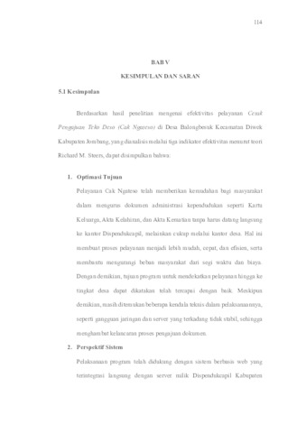 Penelitian ini bertujuan untuk menganalisis dan mendeskripsikan efektivitas layanan Cetak Pengajuan Teko Deso (Cak Ngateso) di Desa Balongbesuk, Kecamatan Diwek, Kabupaten Jombang. Cak Ngateso adalah inovasi layanan administratif berbasis web yang diluncurkan oleh Kantor Kependudukan dan Pencatatan Sipil Kabupaten Jombang sejak tahun 2021, yang berfokus pada layanan seperti Kartu Keluarga, akta kelahiran, dan akta kematian di tingkat desa. Penelitian ini menggunakan metode kualitatif dengan pendekatan studi kasus. Data dikumpulkan melalui wawancara, observasi, dan dokumentasi, kemudian dianalisis menggunakan model efektivitas organisasi Richard M. Steers, yang mencakup indikator optimasi tujuan, perspektif sistem, dan tekanan pada perilaku. Temuan penelitian menunjukkan bahwa secara keseluruhan, layanan Cak Ngateso di Desa Balongbesuk telah efektif dalam memfasilitasi warga dalam mengurus dokumen kependudukan tanpa harus mengunjungi Kantor Kependudukan dan Pencatatan Sipil. Hal ini dibuktikan dengan meningkatnya jumlah pengguna layanan setiap tahun dan kemampuan aparatur desa dalam mengoperasikan sistem. Namun, masih terdapat tantangan teknis seperti gangguan server dan keterbatasan infrastruktur yang dapat menghambat proses layanan. Penelitian ini merekomendasikan peningkatan kapasitas sumber daya manusia, perbaikan infrastruktur teknologi, dan optimasi sistem untuk memastikan layanan Cak Ngateso dapat beroperasi lebih stabil dan menjangkau semua desa yang ada di Kabupaten Jombang. Kata kunci: Efektivitas Layanan, Cak Ngateso, Administrasi Kependudukan,