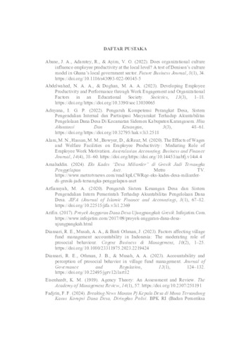Nada, Indah Qothrun (2025) Pengaruh Pengendalian Internal, Kompetensi Perangkat Desa, dan Employee Productivity Terhadap Akuntabilitas Pengelolaan Dana Desa Dengan Budaya Organisasi Sebagai Variabel Moderasi (Penelitian Pada Kecamatan Ujungpangkah Kabupaten Gresik). Undergraduate thesis, UPN Veteran Jawa Timur.