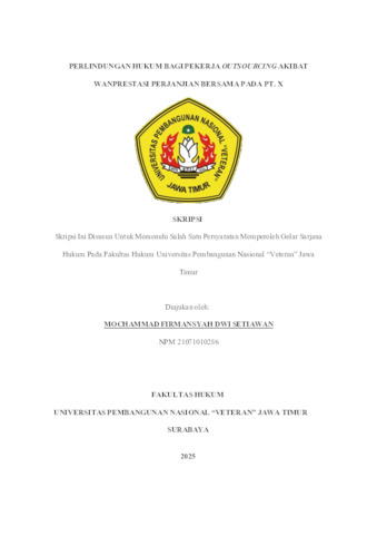 Setiawan, Mochammad Firmansyah Dwi (2025) Perlindungan Hukum Bagi Pekerja Outsourcing Akibat Wanprestasi Perjanjian Bersama Pada PT. X. Undergraduate thesis, UPN Veteran Jawa Timur.