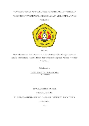 Prabaswara, Ganis Raditya (2025) Tanggung Gugat Pengguna Gedung Perbelanjaan Terhadap Pengunjung Yang Mengalami Kecelakaan Akibat Malafungsi Fasilitas. Undergraduate thesis, UPN Veteran Jawa Timur.