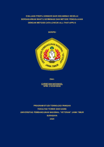 Natanael, Christian (2025) EVALUASI PROFIL SENSORI SARI KECAMBAH KEDELAI BERDASARKAN WAKTU GERMINASI DAN METODE PENGOLAHAN DENGAN METODE CATA (CHECK-ALL-THAT-APPLY). Undergraduate thesis, UPN Veteran Jawa Timur.