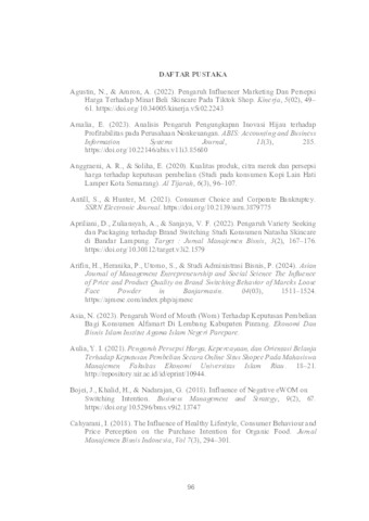 Putri, Anggy Kinaya (2025) PENGARUH PERCEIVED PRICE, NEGATIVE ELECTRONIC WORD OF MOUTH (NE-WOM), DAN VARIETY SEEKING TERHADAP BRAND SWITCHING DARI BRAND AFTERLIFE PADA GENERASI Z DI KOTA SURABAYA. Undergraduate thesis, UPN Veteran Jawa Timur.