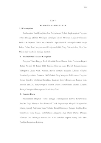 This study aims to describe the implementation of the Tuban Bangga (Tuban Mbangun Keluarga) Program in reducing the rate of early marriage in Tuban Regency. The background of this study is based on the high rate of child marriage in Tuban Regency, which has various social and economic impacts. To understand the implementation of the program, this study uses the public policy implementation theory of Van Meter and Van Horn, which includes six variables, namely policy standards and objectives, resources, inter-organizational communication, characteristics of the implementing agency, implementer disposition, and social, economic, and political conditions. The research method used was descriptive qualitative with data collection techniques through interviews, observation, and documentation. The results showed that the implementation of the Tuban Bangga Program had been quite successful despite facing limitations in resources and technical regulations. This program was still implemented through School Age Youth Guidance (BRUS) activities that provided education on the prevention of early marriage. Inter-agency communication runs smoothly through regular monitoring and evaluation forums, while the attitude of the implementers shows a high level of commitment and responsibility. Political support from the Regent of Tuban is a dominant factor in ensuring the sustainability of the program, although social and economic support still needs to be strengthened. Overall, the implementation of the Tuban Bangga Program is considered successful. Keywords: Policy implementation, Tuban Bangga Program, Early Marriage