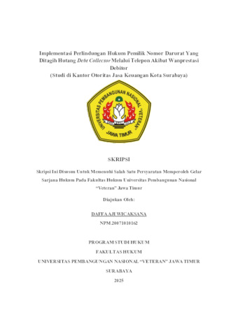 Wicaksana, Daffa Aji (2025) Implementasi Perlindungan Hukum Pemilik Nomor Darurat Yang Ditagih Hutang Debt Collector Melalui Telepon Akibat Wanprestasi Debitor (Studi di Kantor Otoritas Jasa Keuangan Kota Surabaya). Undergraduate thesis, Universitas Pembangunan Nasional "Veteran" Jawa Timur.