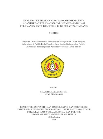 Aulia Safitri, Shavira (2025) Evaluasi Kebijakan Ning Yaonah (Nikmatnya Ngantri dan Pelayanan Online Mudah) Dalam Pelayanan Akta Kematian Di Kabupaten Jombang. Undergraduate thesis, UPN "VETERAN" JAWA TIMUR.