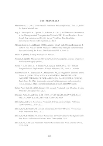 Penelitian ini bertujuan untuk menganalisis strategi Pemerintah Kabupaten Sidoarjo dalam mengatasi kemacetan lalu lintas di Kecamatan Krian, wilayah dengan tingkat mobilitas tinggi sekaligus kawasan industri yang menjadikan persoalan kemacetan sebagai isu mendesak. Penelitian ini menggunakan metode kualitatif deskriptif dengan memanfaatkan data primer melalui wawancara terstruktur kepada Dinas Perhubungan Kabupaten Sidoarjo, Satuan Lalu Lintas Polsek Krian, Sekretariat Daerah, dan masyarakat setempat, serta data sekunder berupa dokumen resmi, laporan pemerintah, jurnal ilmiah, dan pemberitaan relevan. Teknik pengumpulan data dilakukan melalui wawancara, observasi pada titik-titik kemacetan, serta dokumentasi lapangan. Analisis SOAR digunakan untuk mengidentifikasi permasalahan dengan menggunakan analisis kekuatan (Strength), peluang (Opportunities), aspirasi (Aspirations), dan hasil (Results) yang ingin dicapai. Hasil penelitian menunjukkan bahwa pemerintah daerah telah melaksanakan berbagai langkah strategis seperti rekayasa lalu lintas, pembangunan infrastruktur, penertiban bahu jalan, pemanfaatan teknologi, serta patroli rutin oleh aparat kepolisian. Koordinasi antara Sekretariat Daerah Kab. Sidoarjo, Dinas Perhubungan Kab. Sidoarjo, dan Kepolisian Sektor Kiran menjadi kekuatan utama dalam implementasi kebijakan, namun efektivitasnya masih belum optimal akibat keterbatasan sarana prasarana, perilaku masyarakat, serta belum terintegrasinya sistem data lintas instansi untuk evaluasi jangka panjang. Temuan penelitian ini penting karena memberikan gambaran komprehensif mengenai pola penanganan kemacetan sekaligus menegaskan perlunya penguatan tata kelola transportasi berbasis teknologi, data real-time, kolaborasi multipihak, dan pengukuran hasil yang terstruktur. Dengan demikian, penelitian ini diharapkan dapat menjadi masukan strategis bagi Pemerintah Kabupaten Sidoarjo untuk merumuskan kebijakan penanganan kemacetan yang lebih adaptif, akuntabel, dan berkelanjutan di masa mendatang. Kata kunci: Kemacetan; Krian; Strategi Pemerintah; SOAR.