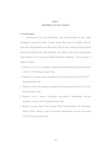 Pelayanan Via Online (Plavon) merupakan layanan digital pada Dinas Kependudukan dan Pencatatan Sipil di Kab. Sidoarjo. Plavon dirilis pada tahun 2021 dengan tujuan memudahkan masyarakat dalam mengurus pengajuan berkas kependudukan. Pada tahun 2024 jumlah pengajuan gagal atau tidak berhasil mencapai 30.728 pengajuan dengan presentase sebesar 24,57% dari jumlah pengajuan total. Oleh karena itu, penelitian ini bertujuan untuk mengetahui kualitas dari layanan digital Pelayanan Via Online (Plavon) pada Dinas Kependudukan dan Pencatatan Sipil di Kab. Sidoarjo dengan masyarakat sebagai pengguna. Penelitian ini menggunakan metode kuantitatif deksriptif dengan simple random sampling sebagai teknik pengambilan sample. Menggunakan teori E-Govqual (Papadomichelaki & Mentzas, 2012) dengan empat dimensi yaitu ease of use (kemudahan pengguna), trust (kepercayaan), realibility (keandalan), dan citizen support (dukungan masyarakat). Hasil penelitian menunjukkan bahwa kualitas layanan digital Pelayanan Via Online (Plavon) pada Dinas Kependudukan dan Pencatatan Sipil di Kab. Sidoarjo secara keseluruhan memperoleh rata-rata presentase 77,67% dengan kategori baik. Dimensi kemudahan penggunaan memperoleh rata-rata presentase sebesar 77,68%, dimensi kepercayaan memperoleh rata-rata presentase 78,33%, dimensi keandalan memperoleh rata- rata presentase 75,41%, dan dan dimensi dukungan masyarakat memperoleh rata- rata presentase 79,25%.