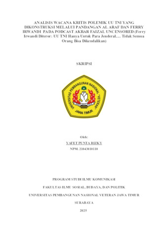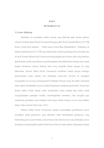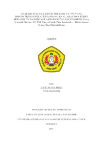 Rizky, Yafet Punta (2025) ANALISIS WACANA KRITIS POLEMIK UU TNI YANG DIKONSTRUKSI MELALUI PANDANGAN AL ARAF DAN FERRY IRWANDI PADA PODCAST AKBAR FAIZAL UNCENSORED (Ferry Irwandi Diteror: UU TNI Hanya Untuk Para Jenderal..... Tidak Semua Orang Bisa Dikendalikan). Undergraduate thesis, UPN Veteran Jawa Timur.