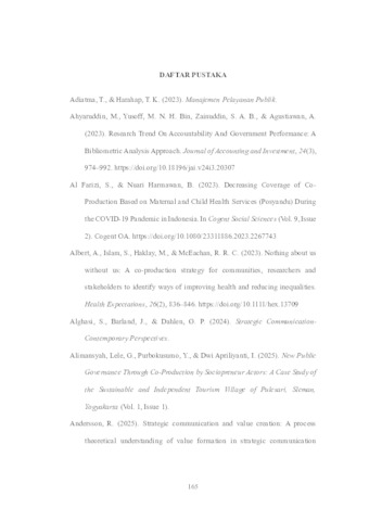 This study aims to analyze the implementation of co-production management in the 1,000 Days Of Life Assistance Program as an effort to reduce stunting at the Kalirungkut Public Health Center, Surabaya City. The research employs the co-production theory of Cepiku (2020), which encompasses seven dimensions: institutional arrangements, planning, communication strategies, management of lay actors, management of professionals, leadership, and accountability and performance measurement. This study uses a qualitative approach with a case study strategy. Informants were selected through purposive sampling, including representatives from the Surabaya City Health Office, health workers at the Kalirungkut Public Health Center, Surabaya Hebat Cadres, and parents of children at risk of stunting. Data were collected through semi-structured interviews, field observations, and documentation, then analyzed using the Miles and Huberman model through data condensation, data display, and conclusion drawing. The findings indicate that the implementation of co-production in the 1,000 Days Of Life Assistance Program is supported by strong regulatory foundations, structured planning, and clear role distribution between health professionals and cadres. Health workers perform key technical functions such as health examinations, nutritional monitoring, early detection, and decision-making for interventions, while cadres play an essential role at the community level through routine assistance, home visits, and monitoring of children’s conditions. Accountability and reporting mechanisms operate effectively through regular monitoring and digital systems. However, community participation and the involvement of Surabaya Hebat Cadres in the planning stage remain limited and tend to be passive, and health workers have not received formal training related to collaboration with non-professional actors. Keywords:1000 HPK; Co-production; Stunting Reduction.