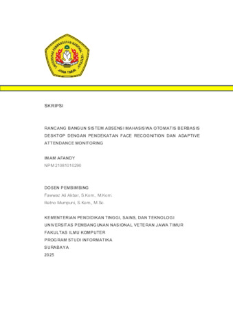 Imam, Afandy (2026) Rancang Bangun Sistem Absensi Mahasiswa Otomatis Berbasis Desktop dengan Pendekatan Face Recognition dan Adaptive Attendance monitoring. Undergraduate thesis, UPN Veteran JawaTimur.