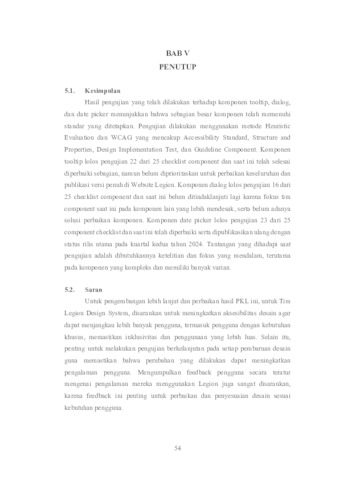 Masyarakat modern sangat bergantung pada teknologi, di mana aplikasi perangkat lunak memainkan peran penting melalui UI dan UX. PT Telekomunikasi Indonesia, sebagai perusahaan teknologi terkemuka, berupaya meningkatkan kualitas desain produk digital mereka dengan menggunakan Legion Design System. Sistem ini adalah kumpulan komponen desain yang konsisten dan terstandarisasi untuk memastikan keseragaman dan efisiensi di seluruh produk digital Telkom. Telkom Design di Jakarta Pusat bertanggung jawab atas pengembangan ini, dengan fokus pada konsistensi desain dan kolaborasi antar tim. Tujuan dari PKL ini adalah untuk memastikan konsistensi dan efisiensi desain pada produk digital Telkom dengan pengembangan Legion Design System. Metode yang digunakan dalam pengujian ini adalah Heuristic Evaluation yang terdiri dari 10 prinsip evaluasi heuristik oleh Jacob Nielsen, serta Web Content Accessibility Guidelines (WCAG) untuk memastikan aksesibilitas komponen desain. Proses pengujian dilakukan secara menyeluruh pada berbagai komponen seperti tooltip, dialog, dan date picker dengan menggunakan Figma dan plugin, seperti Color Contrast untuk menguji standar aksesibilitas. Hasil dari pelaksanaan praktik kerja lapangan ini menunjukkan bahwa pengujian Berkelanjutan dan iteratif pada setiap pembaruan desain dapat meningkatkan pengalaman pengguna. Temuan menunjukkan adanya beberapa poin yang perlu diperbaiki dalam desain komponen untuk memenuhi standar aksesibilitas dan kualitas yang diharapkan. Selain itu, feedback pengguna yang dikumpulkan secara teratur memberikan masukan berharga untuk perbaikan berkelanjutan.