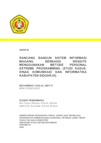 Al Abiyyi, Muhammad Faiq (2026) RANCANG BANGUN SISTEM INFORMASI MAGANG BERBASIS WEBSITE MENGGUNAKAN METODE PERSONAL EXTREME PROGRAMMING (STUDI KASUS: DINAS KOMUNIKASI DAN INFORMATIKA KABUPATEN SIDOARJO). Undergraduate thesis, UPN Veteran Jawa Timur.