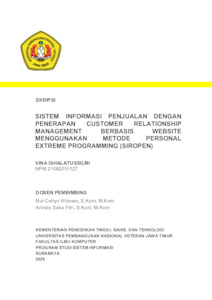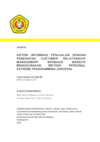 Ishalatussilmi, Vina (2026) SISTEM INFORMASI PENJUALAN DENGAN PENERAPAN CUSTOMER RELATIONSHIP MANAGEMENT BERBASIS WEBSITE MENGGUNAKAN METODE PERSONAL EXTREME PROGRAMMING (SIROPEN). Undergraduate thesis, UPN “VETERAN” JAWA TIMUR.