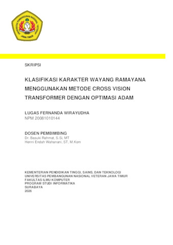 Wirayudha, Lugas Fernanda (2026) Klasifikasi Karakter Wayang Ramayana Menggunakan Cross Vision Transformer Dengan Optimasi Adam. Undergraduate thesis, Universitas Pembangunan Nasional Veteran Jawa Timur.