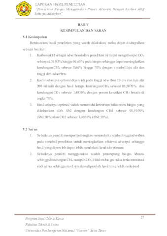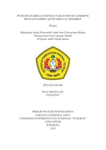 Prasojo, Riyas Hadi (2025) PEMURNIAN BIOGAS MENGGUNAKAN PROSES ADSORPSI DENGAN KARBON AKTIF SEBAGAI ADSORBEN. Undergraduate thesis, UPN Veteran Jawa Timur.