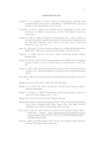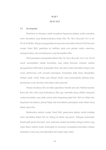 ABSTRAK Media memiliki peran penting dalam membentuk dan mereproduksi standar kecantikan perempuan melalui berbagai representasi visual, salah satunya film. Film The Most Beautiful Girl in the World yang ditayangkan di Netflix mengangkat isu mitos kecantikan dalam konteks industri media melalui narasi kontes pencarian perempuan tercantik. Penelitian ini bertujuan untuk menganalisis bagaimana penerimaan pekerja media terhadap mitos kecantikan yang direpresentasikan dalam film tersebut. Penelitian ini menggunakan pendekatan kualitatif dengan paradigma konstruktivis dan metode analisis resepsi audiens berdasarkan teori encoding–decoding Stuart Hall. Pengumpulan data dilakukan melalui wawancara mendalam terhadap lima informan yang bekerja di industri media. Analisis juga menggunakan konsep mitos kecantikan Naomi Wolf sebagai landasan untuk membaca pesan dominan dalam film. Hasil penelitian menunjukkan bahwa penerimaan informan terhadap mitos kecantikan berada pada tiga posisi resepsi, yaitu dominan, negosiasi, dan oposisi. Sebagian informan menerima kecantikan sebagai realitas profesional dalam industri media, sementara informan lain menegosiasikan dan bahkan menolak standar kecantikan dominan dengan menekankan kompetensi dan nilai personal. Penelitian ini menunjukkan bahwa pengalaman profesional dan latar sosial pekerja media memengaruhi cara mereka memaknai mitos kecantikan yang ditampilkan dalam film. Kata kunci: mitos kecantikan, analisis resepsi, pekerja media, film, Netflix