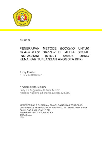 Rianto, Rizky (2026) Penerapan Metode Rocchio Untuk Klasifikasi Buzzer Di Media Sosial Instagram (Study Kasus Demo Kenaikan Tunjangan Anggota Dpr). Undergraduate thesis, UPN Veteran Jawa Timur.