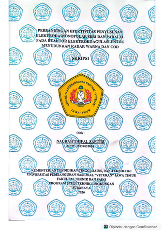 Safitri, Naurah Thifal (2026) PERBANDINGAN EFEKTIVITAS PENYUSUNAN ELEKTRODA MONOPOLAR SERI DAN PARALEL PADA REAKTOR ELEKTROKOAGULASI UNTUK MENURUNKAN KADAR WARNA DAN COD. Undergraduate thesis, UPN "Veteran" Jawa Timur.
