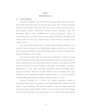 Penyisihan Kandungan Pencemar Fe, Mn Dan Kekeruhan Pada Air Sumur Menggunakan Kombinasi Aerasi Fine Bubble Diffuser Dan Adsorpsi Sistem Kontinyu
