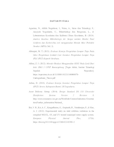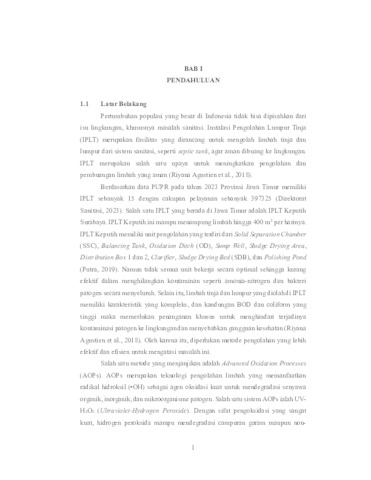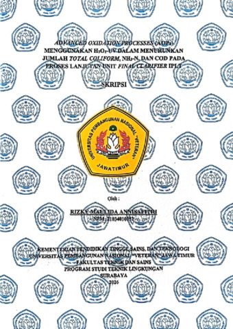 Annisafitri, Rizky Maulida (2026) ADVANCED OXIDATION PROCESSES (AOPs) MENGGUNAKAN H2O2-UV DALAM MENURUNKAN JUMLAH TOTAL COLIFORM, NH3-N, DAN COD PADA PROSES LANJUTAN UNIT FINAL CLARIFIER IPLT. Undergraduate thesis, Universitas Pembangunan Nasional "Veteran" Jawa Timur.