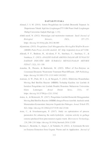 Limbah cair domestik diketahui mengandung beban pencemar organik dan nutrien dalam konsentrasi yang cukup tinggi, sehingga diperlukan teknologi pengolahan yang tepat sebelum air limbah tersebut dilepaskan ke lingkungan. Penelitian ini bertujuan untuk mengevaluasi kinerja Moving Bed Biofilm Reactor (MBBR) yang dioperasikan secara intermittent dengan penambahan eco-enzyme sebagai sumber karbon eksternal dalam mereduksi konsentrasi pencemar utama pada limbah domestik. Percobaan dilaksanakan pada skala laboratorium dengan menerapkan variasi rasio durasi intermittent dan variasi dosis penambahan ecoenzyme. Parameter kualitas air yang diukur dan dianalisis dalam penelitian ini meliputi COD, BOD, dan amonia. Hasil yang diperoleh menunjukkan bahwa sistem MBBR dengan penambahan eco-enzyme mampu menyisihkan pencemar secara signifikan. Penyisihan COD tertinggi mencapai 87% pada dosis eco-enzyme sebesar 1,5%, sedangkan penurunan BOD tertinggi sebesar 89% dicapai pada dosis 2%. Parameter amonia juga mengalami penurunan yang cukup besar, yakni mencapai 93% pada dosis penambahan eco-enzyme sebesar 2%. Seluruh nilai efluen yang dihasilkan dari proses pengolahan ini telah memenuhi ketentuan baku mutu air limbah domestik sebagaimana diatur dalam Peraturan Menteri LHK Nomor 68 Tahun 2016. Secara keseluruhan, penelitian ini membuktikan bahwa MBBR intermittent dengan penambahan eco-enzyme sebagai sumber karbon tambahan merupakan metode pengolahan limbah domestik yang efektif sekaligus berkelanjutan. Kata kunci: Eco-enzyme, limbah domestik, MBBR, proses aerobik-anoksik, sumber karbon eksternal