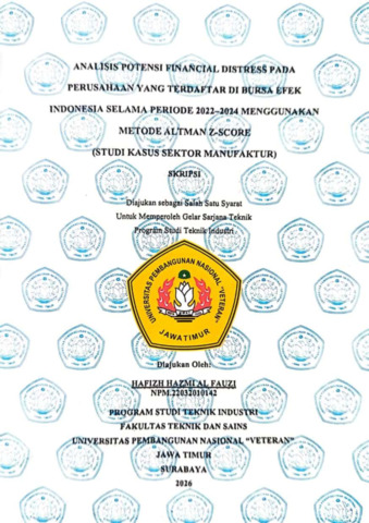 Al Fauzi, Hafizh Hazmi (2026) ANALISIS POTENSI FINANCIAL DISTRESS PADA PERUSAHAAN YANG TERDAFTAR DI BURSA EFEK INDONESIA SELAMA PERIODE 2022–2024 MENGGUNAKAN METODE ALTMAN Z-SCORE (STUDI KASUS SEKTOR MANUFAKTUR). Undergraduate thesis, Universitas Pembangunan Nasional Veteran Jawa Timur.