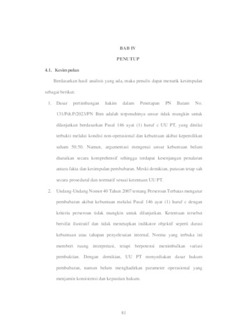 Septyana, Nana (2026) ANALISIS YURIDIS PEMBUBARAN PT OXLEY KARYA INDO BATAM AKIBAT KEBUNTUAN PEMEGANG SAHAM DALAM HAL KEPEMILIKAN SAHAM BERIMBANG (STUDI PENETAPAN NOMOR 131/PDT.P/2023/PN BTM). Undergraduate thesis, UPN "Veteran" Jawa Timur.