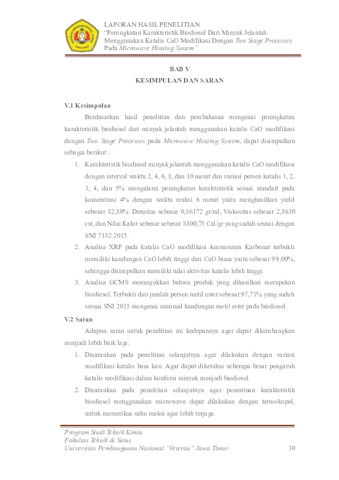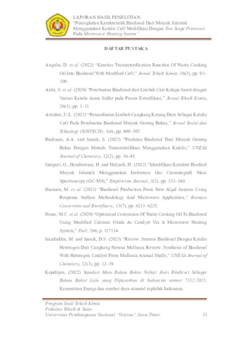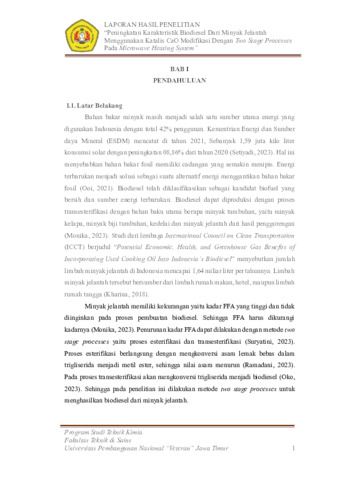 Wati, Ika Yuliana (2026) Peningkatan Karakteristik Biodiesel dari Minyak Jelantah Menggunakan Katalis CaO Modifikasi dengan Two Stage Processes pada Microwave Heating system. Undergraduate thesis, UPN "VETERAN" JAWA TIMUR.