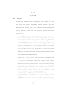 Sertifikat ganda atas tanah yang sama merupakan salah satu dari banyaknya macam sengketa atas tanah yang terjadi di Indonesia. Permasalahan tersebut dapat terjadi karena disebabkan oleh beberapa faktor, baik internal maupun eksternal. Dalam sistem hukum di Indonesia atas tanah yang merujuk pada UU 5/1960 dan PP 24/1997, telah diatur tata cara memperoleh hak atas tanah dengan cara yang dianggap sah secara hukum, yakni melalui pendaftaran tanah. Pendaftaran tanah bertujuan untuk memberikan kepastian hukum bagi pemilik hak melalui proses penerbitan sertifikat. Akan tetapi, praktiknya permasalahan sertifikat ganda tersebut belum dapat memberikan kepastian hukum bagi para pihak. Pada penelitian ini, Penulis melakukan kajian dengan menggunakan metode normatif yang menggunakan bahan hukum berupa peraturan perundang-undangan, studi kasus pada putusan yang terkait, pserta penggunaan pendekatan asas dalam hukum perdata. Melalui penelitian ini, Penulis bertujuan untuk dapat mengetahui pelaksanaan Yurisprudensi MA 5/Yur/Pdt/2018 dalam memandang timbulnya sengketa sertifikat ganda. Selanjutnya, dalam penelitian ini Penulis mendapatkan beberapa kesimpulan, pertama penggunaan bahasa dalam UU 5/1960 masih kaku sehingga memerlukan penafsiran lebih lanjut oleh majelis hakim, kedua PP 24/1997 belum sepenuhnya dijalankan dengan baik, ketiga telah banyak putusan yang mengikuti Yurisprudensi MA 5/Yur/Pdt/2018, namun masih terdapat yang tidak mengikutinya sehingga menimbulkan ketidakpastian hukum bagi para pemegang sertifikat hak atas tanah.