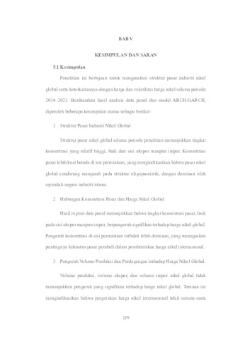The global nickel industry has experienced significant market structure changes and price volatility over the last decade due to increasing demand for nickel as a key raw material in electric vehicle batteries and the global energy transition. This study aims to analyze the effect of market concentration on nickel prices and price volatility during the period 2014–2023. Secondary data were obtained from TradeMap, USGS, and Federal Reserve Economic Data, involving 15 major nickel-producing and consuming countries. The analytical methods include market concentration measurement using the Herfindahl-Hirschman Index (HHI), panel data regression with a semi-log model, and ARCH/GARCH modeling to measure price volatility.The results indicate that both export HHI and import HHI have a positive and significant effect on global nickel prices, confirming that the higher the market concentration, the higher the price level formed. Meanwhile, production volume, export volume, and import volume do not have a statistically significant impact on price movements. The GARCH model results also reveal persistent volatility, with a substantial spike occurring during the 2022 global crisis. Overall, the global nickel market tends to move toward an oligopolistic structure on the supply side and an oligopsonistic structure on the demand side, which increases price sensitivity to policy changes and external shocks. Keywords: Nickel Price, Market Structure, Volatility, International Trade.