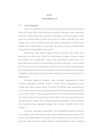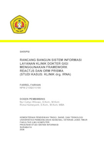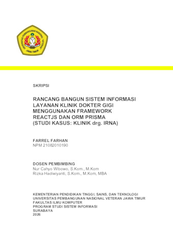 Farhan, Farrel (2026) RANCANG BANGUN SISTEM INFORMASI LAYANAN KLINIK DOKTER GIGI MENGGUNAKAN FRAMEWORK REACTJS DAN ORM PRISMA (STUDI KASUS: KLINIK drg. IRNA). Undergraduate thesis, Universitas Pembangunan Nasional Veteran Jawa Timur.